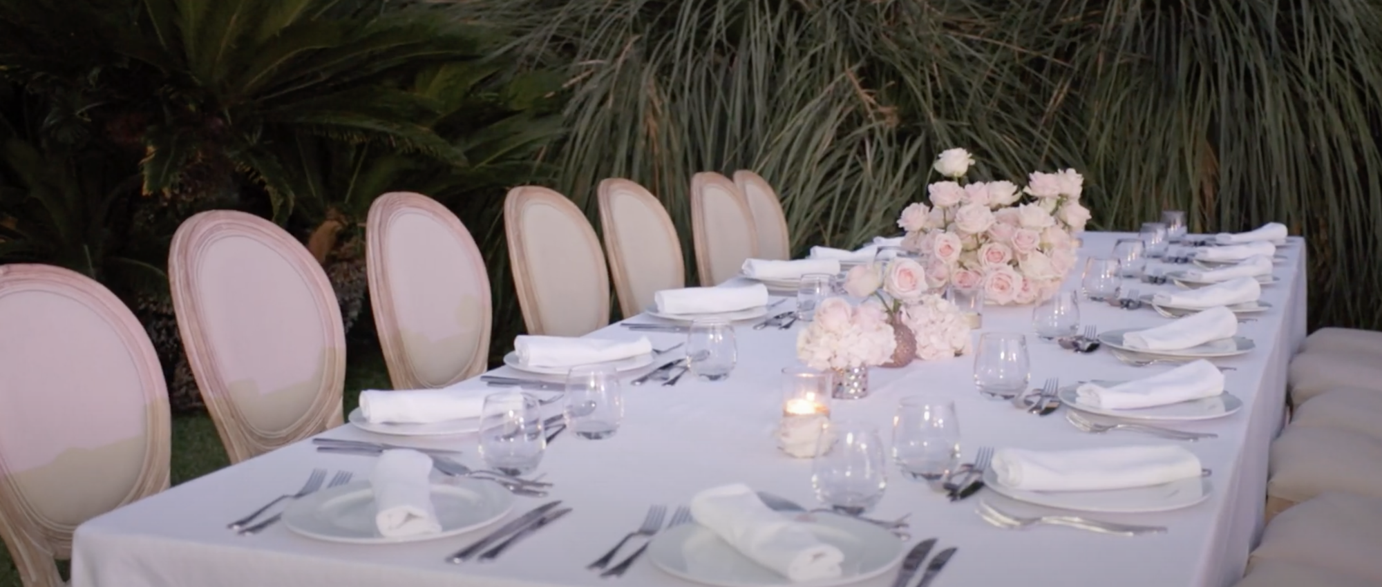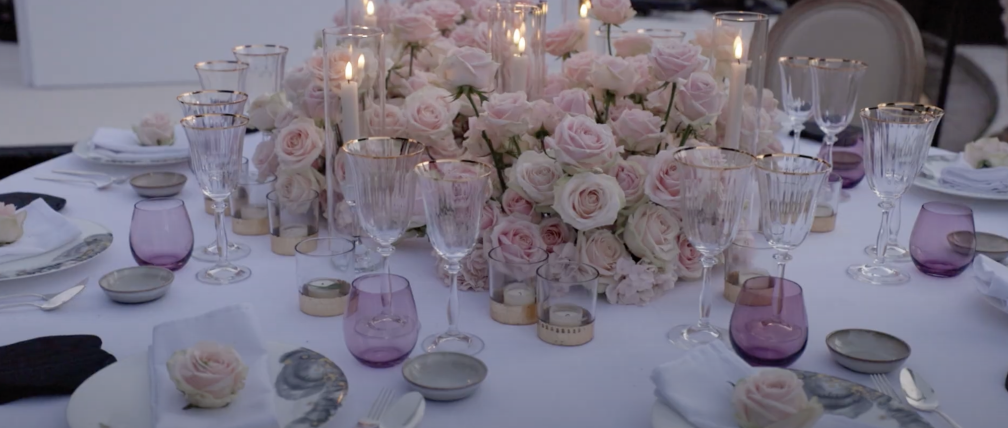 The centrepiece of the evening was a table setting that epitomised sophistication and charm. Soft pink roses cascaded from the centrepiece, their delicate petals softly illuminated by the warm glow of candlelight. Gold-rimmed crystal glasses and lavender-tinted goblets added a touch of opulence, perfectly complementing the floral theme. The meticulous design ensured that every element contributed to an ambiance of luxury and grace.